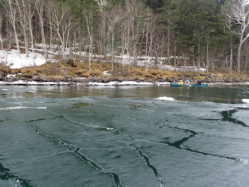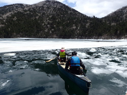 北海道の十勝(とかち)北部に位置し、大雪山国立公園内にある然別湖は、四方を森に囲まれた自然豊かな湖です。標高およそ800mに位置することもあり、冬の間全面に張っていた氷が解けるのは、例年ゴールデンウィーク頃になります。氷が解けてカヌーに乗れるようになる日は毎年異なりますが、湖上に氷が残っていたり、岸辺の森に雪の残る風景はこの時期ならではの風景になります。湖の氷が解けていなかったり、解氷が進んでいても乗り降りする場所に氷が溜まって、カヌーが出来ない場合もありますが、チャンスがあれば、この独特の風景のなかでカヌーに乗ってみたいという方は是非トライしてみてください。然別湖がまだ凍っていて乗れない場合は中止になります。