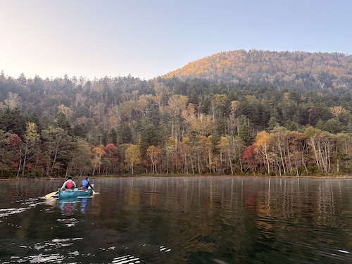 然別湖の朝のカヌー。朝日が紅葉した森を少しづつ照らし出していく様子を眺めながら漕ぎました。後半は雲が入ってきて青空を隠してしまいましたが、今度は雲が幻想的な風景を見せてくれました。
