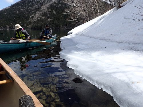 北海道の十勝(とかち)北部に位置し、大雪山国立公園内にある然別湖は、四方を森に囲まれた自然豊かな湖です。標高およそ800mに位置することもあり、冬の間全面に張っていた氷が解けるのは、例年ゴールデンウィーク頃になります。氷が解けてカヌーに乗れるようになる日は毎年異なりますが、湖上に氷が残っていたり、岸辺の森に雪の残る風景はこの時期ならではの風景になります。湖の氷が解けていなかったり、解氷が進んでいても乗り降りする場所に氷が溜まって、カヌーが出来ない場合もありますが、チャンスがあれば、この独特の風景のなかでカヌーに乗ってみたいという方は是非トライしてみてください。然別湖がまだ凍っていて乗れない場合は中止になります。